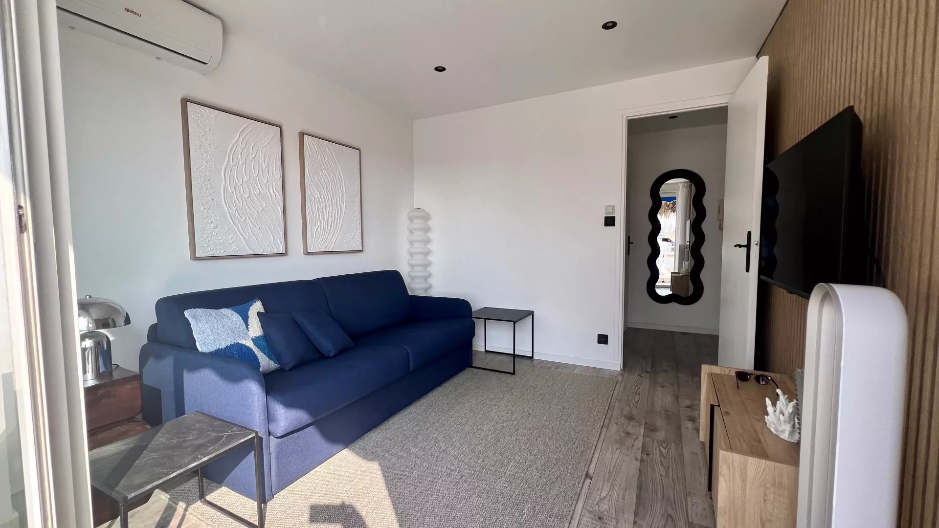 Rare en Dernier étage avec ascenseur proche du Mouré rouge, magnifique studio meublé avec jolie terrasse ensoleillée, entièrement rénové , et climatisé, stores electriques , cuisine séparée équipée moderne, coup de coeur assuré, libre pour quelques mois ou pour une année,
